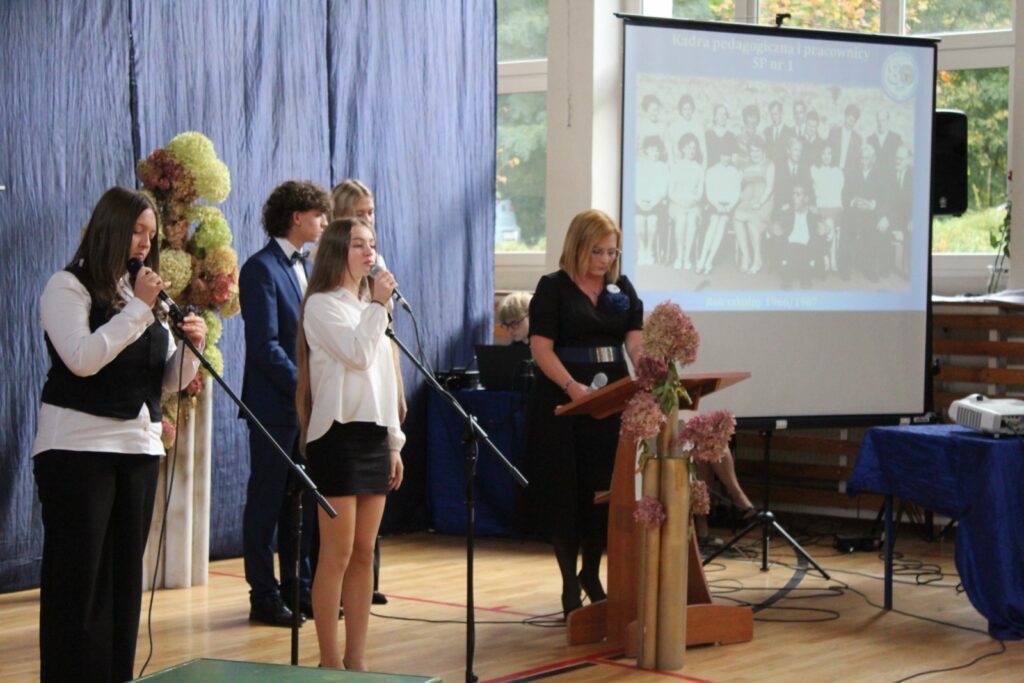 Dyrektor Szkoły Monika Dźwigaj przedstawiła najważniejsze wydarzenia z bogatych dziejów Szkoły Podstawowej nr 1 w Przemkowie. Celem prezentacji było nakreślenie rysu historycznego i pokazanie zmian zachodzących w szkole na przestrzeni minionych 80 lat. Krótki wywód o historii szkoły i jej tradycjach wzbogaciły wymowne występy uczniów Zespołu Szkół w Przemkowie.