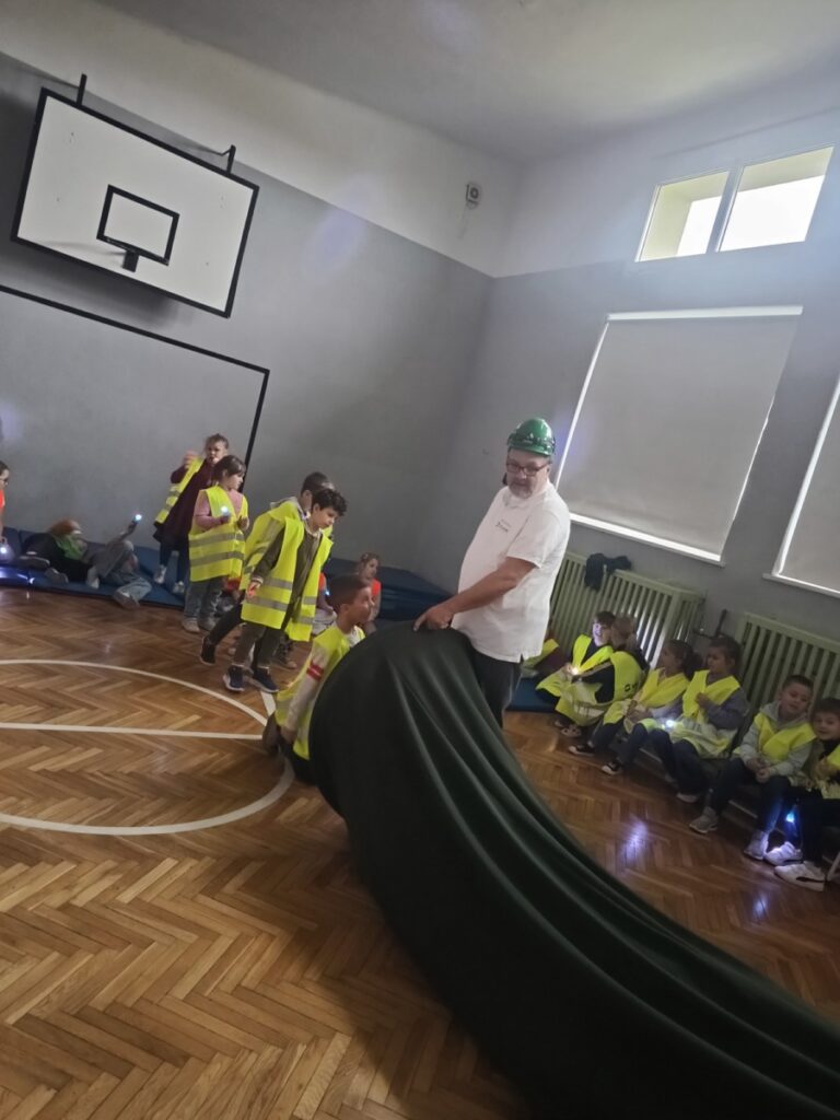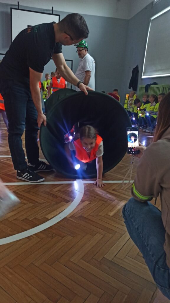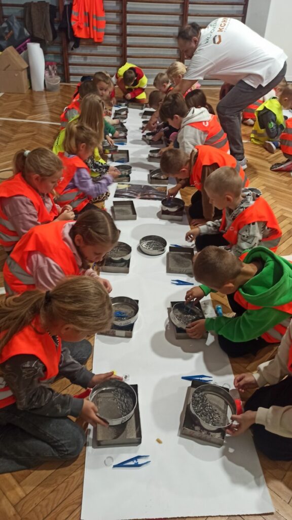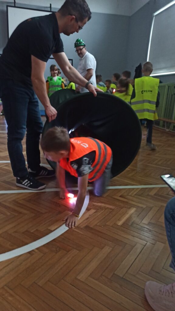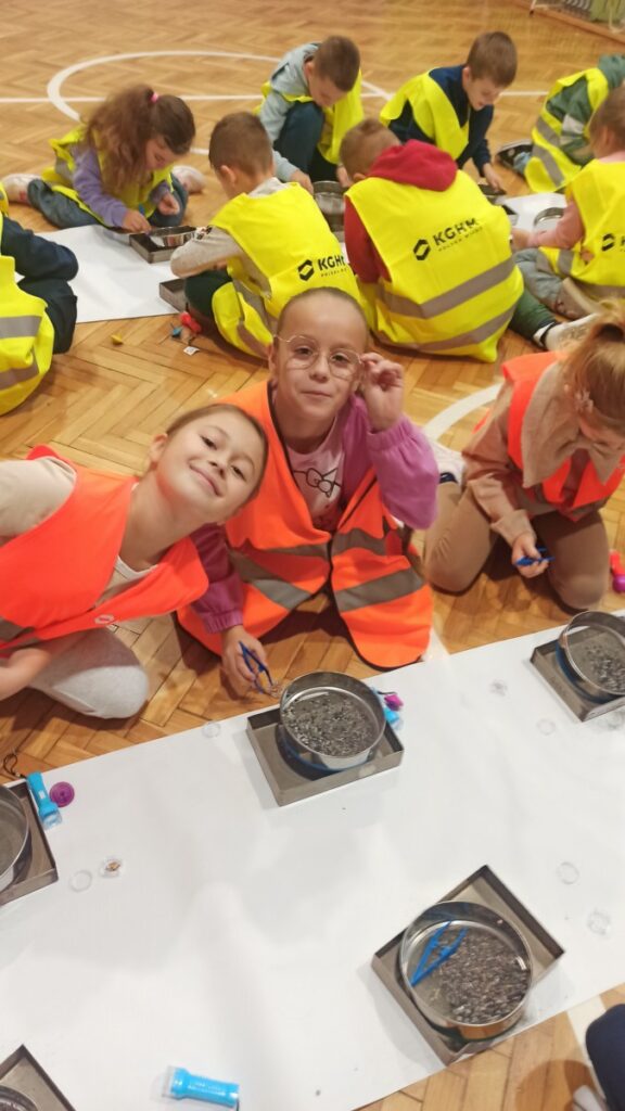 Dzieci z wielkim zaciekawieniem wysłuchały wypowiedzi o pracy górników w oparciu o zdjęcia i piękną wystawę lamp, kasków i innych akcesoriów. Ciekawa sceneria przybliżająca kopalnię wprowadziła dziewczynki i chłopców w tematykę „Skąd się bierze miedź?” i jak wygląda jej proces wydobywania. Potem wszystkie klasy jako brygady górnicze otrzymały kamizelki odblaskowe oraz latarki i wyruszyły windą w dół kopalni. W wielkiej gotowości i z zaangażowaniem przechodząc przez tunel, szukały rud miedzi. Szczęśliwi uczniowie zaczęli kruszyć skały minerałów, które imitowały piłeczki, zbierając je do wagoników. Ile śmiechu i radości wywołała ta zabawa, która nie szczędziła ich sił. Zadaniem klas I – III było odszukać na sitku małe drobinki rudy miedzi. Potem ruda była załadowana do wagoników na powierzchnię do Zakładu Wzbogacenia Rud, a po kolejnych obróbkach do huty miedzi. Wszystkie brygady zadowolone z przygody wracały na powierzchnię przy gongu dzwonu, przechodząc przez ciemne korytarze kopalni z latarkami. To była niezwykła wyprawa, pełna emocji, ciekawości, za którą to pracę uczniowie zostali nagrodzeni przez górników niespodziankami. Na ręce gości dzieci wręczyły Dyplomy Podziękowania. To była niezapomniana lekcja o trudzie pracy górnika, który pozyskuje z wydobytej rudy miedź oraz wielka wycieczka do „kopalni” uwieczniona na pamiątkowych zdjęciach.