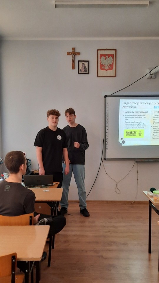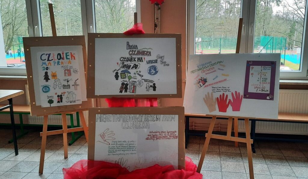 Międzynarodowy Dzień Praw Człowieka obchodzony jest co roku 10 grudnia w rocznicę przyjęcia przez ONZ w 1948 roku Powszechnej Deklaracji Praw Człowieka. Uczniowie klasy 8a pod opieką pani Iwony Łopacińskiej-Skraba, realizując projekt edukacyjny, aktywnie włączyli się w obchody tego dnia. Celem akcji było uświadomienie społeczności szkolnej, że choć często postrzegamy prawa człowieka jako abstrakcyjne zasady, to w rzeczywistości dotyczą one naszej godności, bezpieczeństwa i poczucia, że jesteśmy wolni. Na korytarzu zaprezentowano prace plastyczne, które ukazywały różne aspekty praw człowieka. W sali 04 wyświetlono prezentację przygotowaną prze uczniów oraz krótkie filmy edukacyjne udostępnione przez Amnesty International. Zaprezentowane materiały multimedialne podkreślały, że fundamentem praw człowieka jest godność, czyli szacunek zarówno do siebie, jak i wobec innych. Swoją wiedzę na temat wolności oraz praw człowieka uczniowie mogli sprawdzić rozwiązując krzyżówki i rebusy.