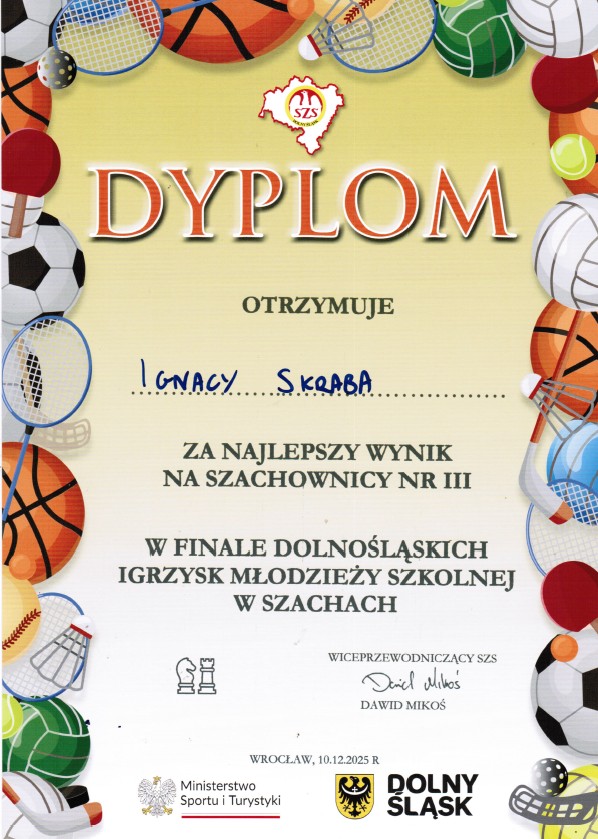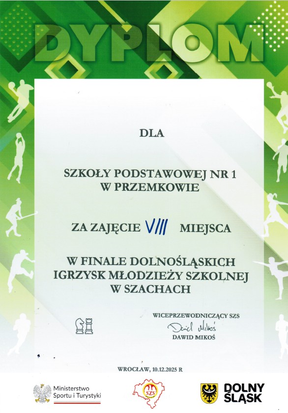 W środę, 10 grudnia 2025r roku w Centrum Kreatywności Talent we Wrocławiu odbyły się Wojewódzkie Finały w Szachach Drużynowych w ramach Dolnośląskich Igrzysk Dzieci i Igrzysk Młodzieży Szkolnej. Szkoła Podstawowa nr 1 im. Janusza Korczaka w Zespole Szkół w Przemkowie, jako Mistrz Powiatu, reprezentowała naszą gminę i powiat w Igrzyskach Młodzieży Szkolnej w składzie: Maciej Marciniak, Krzysztof Chrzanowski, Ignacy Skraba i Melania Michniewska. W Wojewódzkim Finale wzięło udział dwadzieścia jeden drużyn z Dolnego Śląska, m.in. z Wrocławia, Bolesławca, Szklarskiej Poręby Jeleniej Góry, Legnicy, Lubania, czy też z Wałbrzycha. Mecze rozgrywano systemem szwajcarskim, siedem rund po 10 minut plus 3 sekundy na zawodnika. Nasi uczniowie wygrali trzy pojedynki, dwa zremisowali i dwa przegrali z drużynami z Wrocławia, które ostatecznie zajęły pierwsze i drugie miejsce. Ostatecznie zdobyli 8 dużych punktów i 12,5 punktów małych. W ostatniej rundzie nasi uczniowie walce o trzecie miejsce rywalizowali z drużyną z Budzowa. Mecz zakończył się remisem 2:2, co spowodowało zajęcie trzeciego miejsca przez szkołę z Budzowa, zaś Szkoła Podstawowa nr 1 z Przemkowa uplasowała się na miejscu VIII.